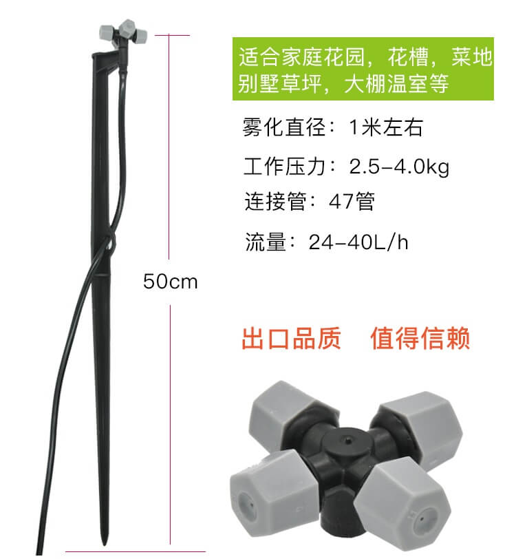性能特點:噴頭完全引進以色列技術,設計采用一種渦流噴嘴,提供渦流噴霧流,限度地降低堵塞的可能性。霧化效果良好,配合防滴器,有效***停噴后的滴漏傷苗現象;分解式構造,便于維修,可使用四出口或單出口噴頭。主要用途:倒置安裝時于適當位置,用于溫室大棚中扦插育苗,以及溫度控制。工程造價相對較低。用于溫室或家禽飼養場的溫度控制。四出口霧化噴頭技術參數 流 量 35L/h 射 程 0.7m 適用水壓 0.21Mpa ~ 0.4Mpa 四出口霧化噴頭采用以色列技術,霧化效果好,配合防滴器,能有效停噴后滴漏傷苗現象,應用于溫室大棚內增濕降溫和家禽飼養場的溫度控制. ◆ 整套采用4個噴嘴和+字聯接,使得霧粒的分布更均勻。 ◆ 高效防滴閥設計,能做到真正停噴止滴,避免滴水傷苗。 ◆ 開閥壓力有高壓(4.0bar)和低壓(2.5bar)兩種。 ◆ 25微米左右的霧粒而無需***壓力,流量40L/h 。 ◆ 是鮮切花溫室、養殖場等加濕降溫的理想產品。 ◆ 建議使用150目或150目以上的過濾器